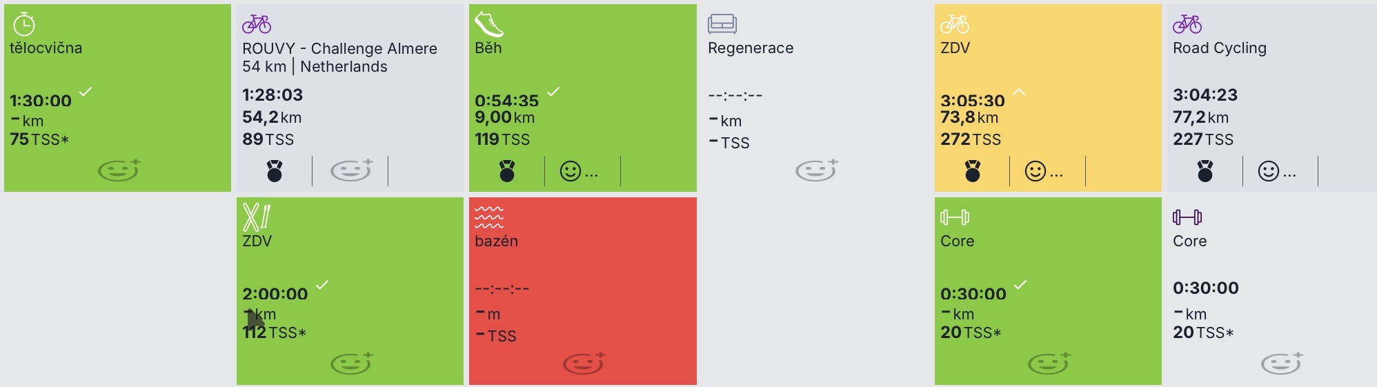 Tato barva značí, že jste trénink sice absolvovali, ale trefili jste se jen do 50 % naplánovaného času nebo TSS. Často se objevuje, když je trénink výrazně kratší, než měl být.